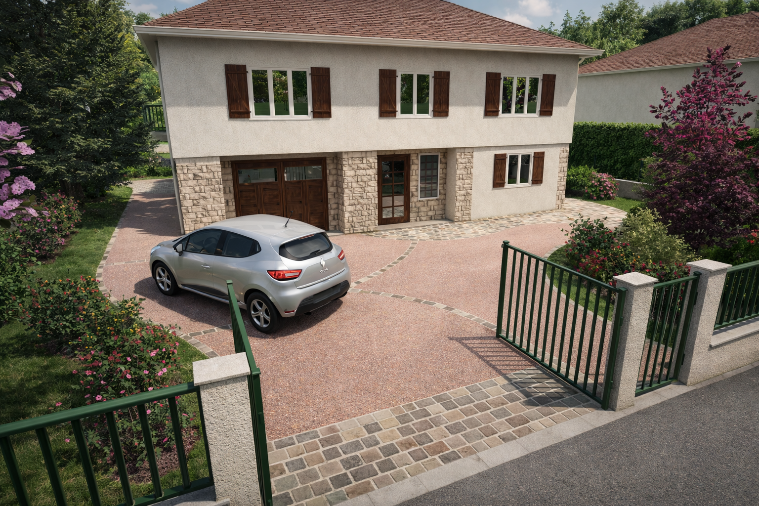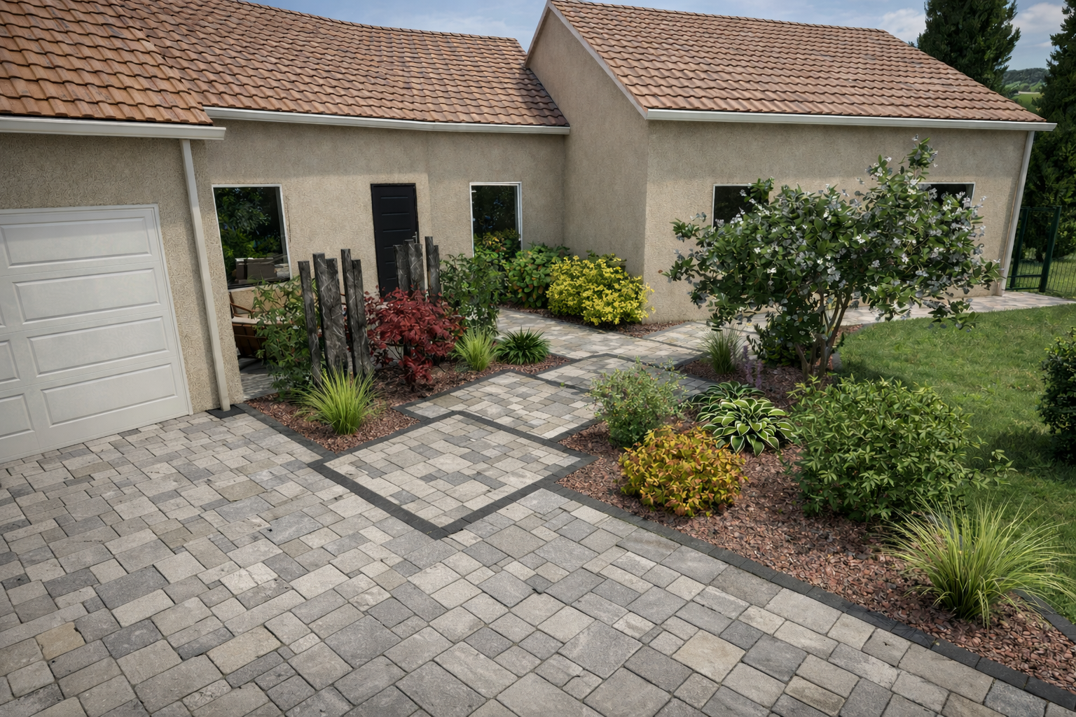 Conception d’une cour en béton désactivé et pavés en pierre naturelle, intégrée dans un environnement végétalisé.