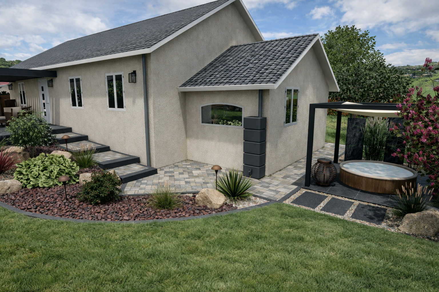 Conception d’un escalier paysager avec coin spa et cheminements en pavés.